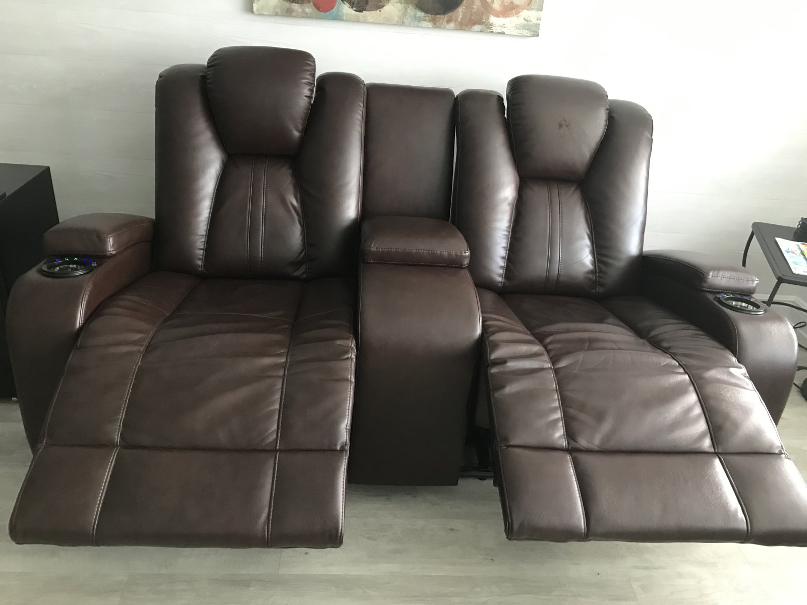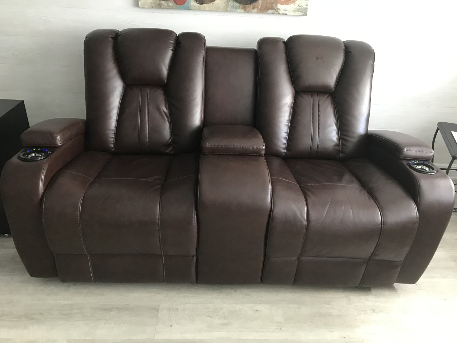 Divan en cuir 2 places (tout cuir) avec console centrale et repose pied manuel de couleur marron